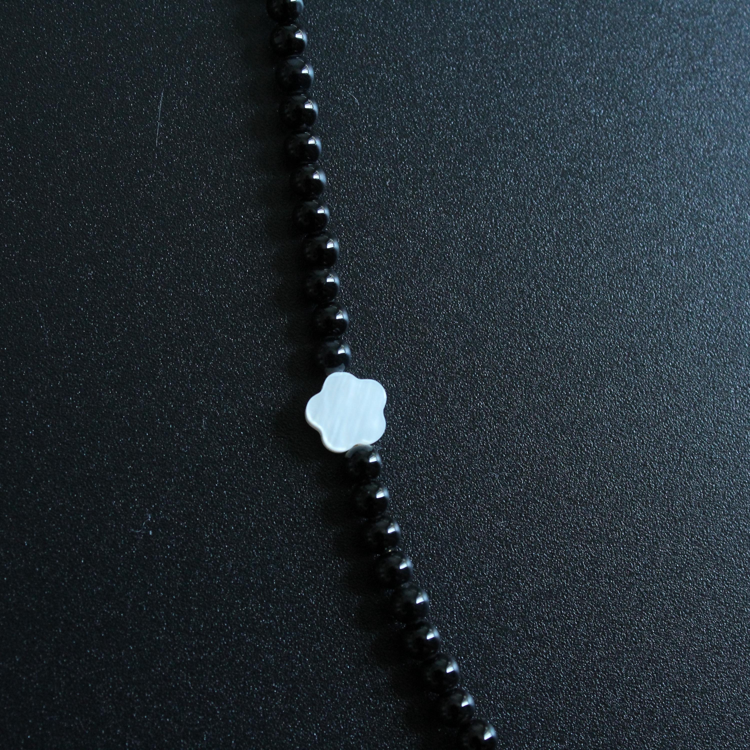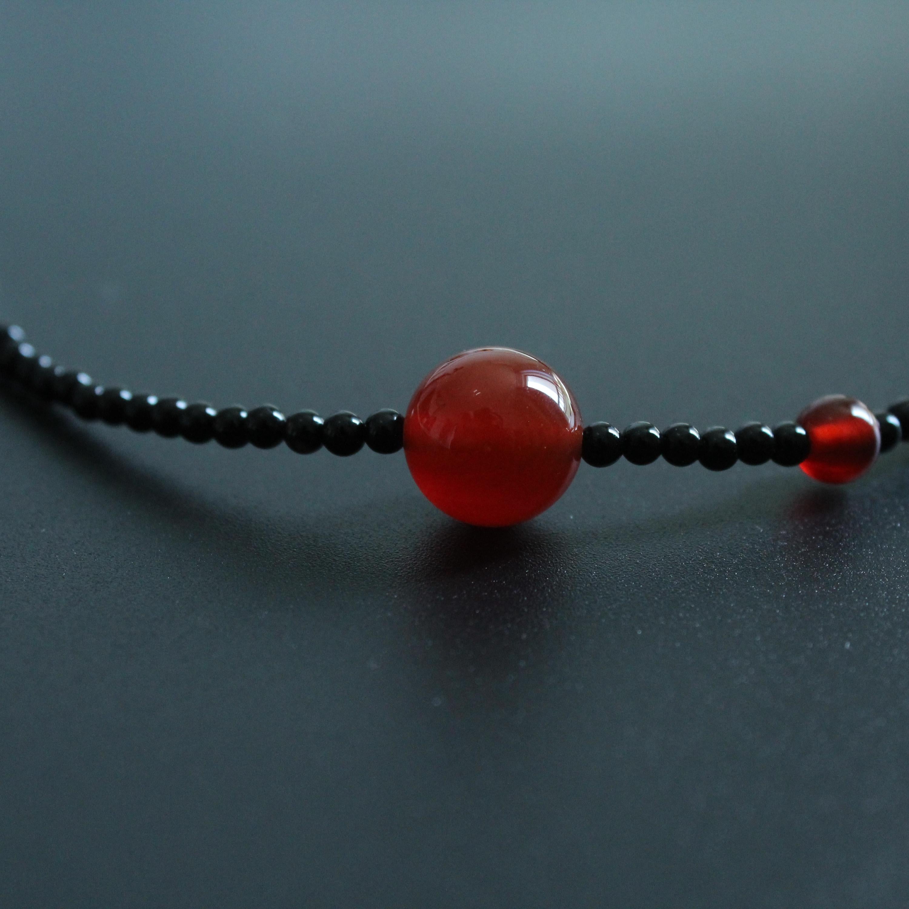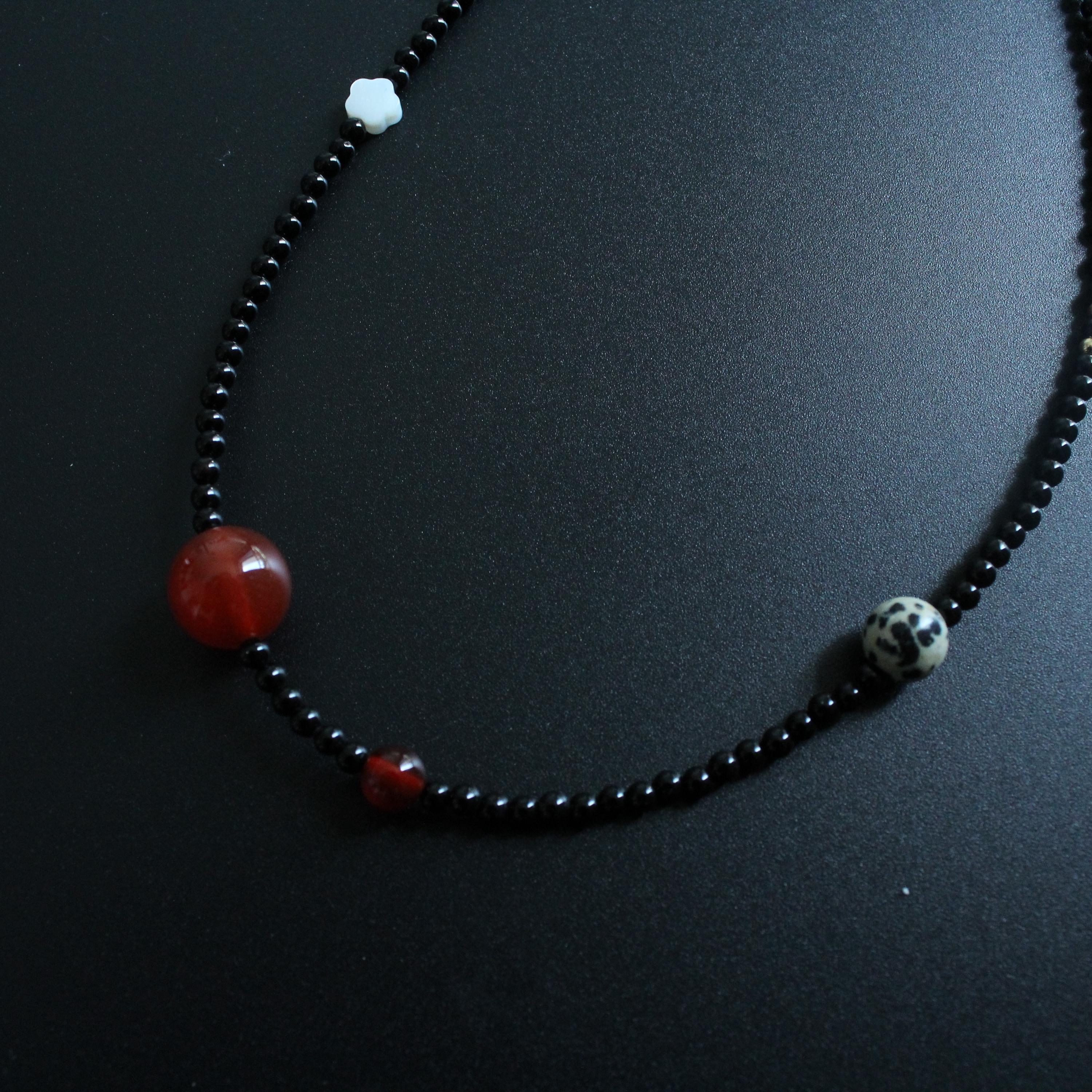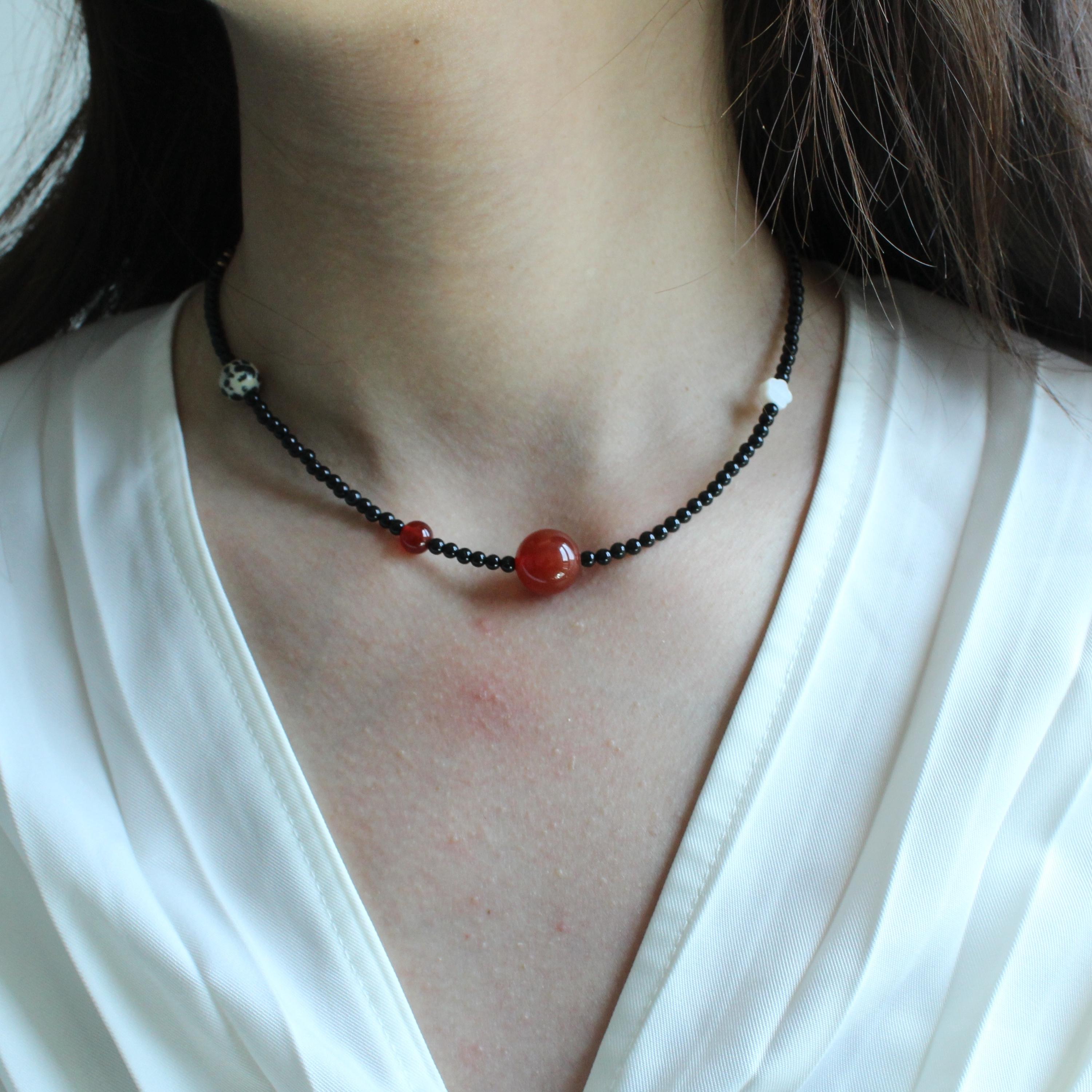 This necklace features a combination of red agate, black onyx, speckled stones, and natural shell, creating a unique blend of textures and colors. Elegant and versatile, it’s perfect for everyday wear or special occasions.